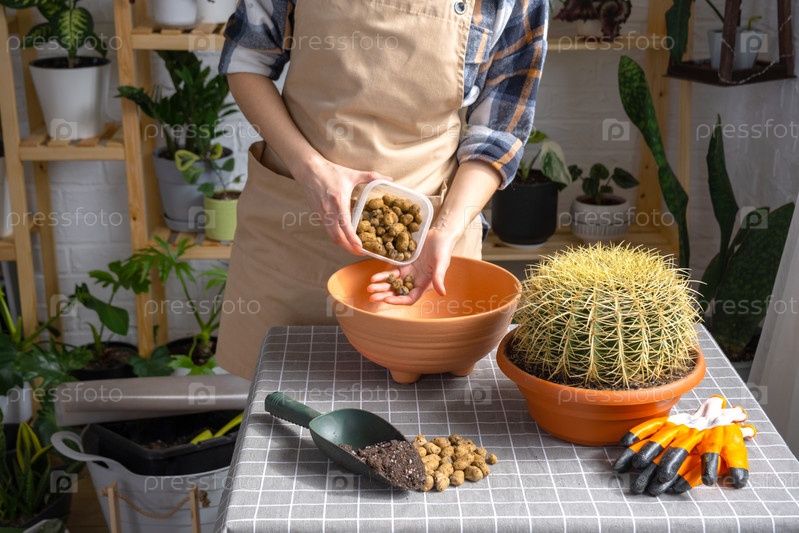 Дренаж из керамзита на дне горшка для пересадки выросшего домашнего растения большого колючего кактуса Echinocactus Gruzoni в новый горшок большего размера