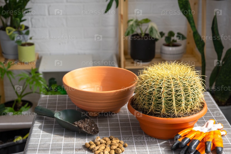 Пересадка выросшего домашнего растения большого колючего кактуса Echinocactus Gruzoni в новый горшок большего размера.Уход за горшечным растением, защитные перчатки, дренаж, горшок, почва, лопата на столе