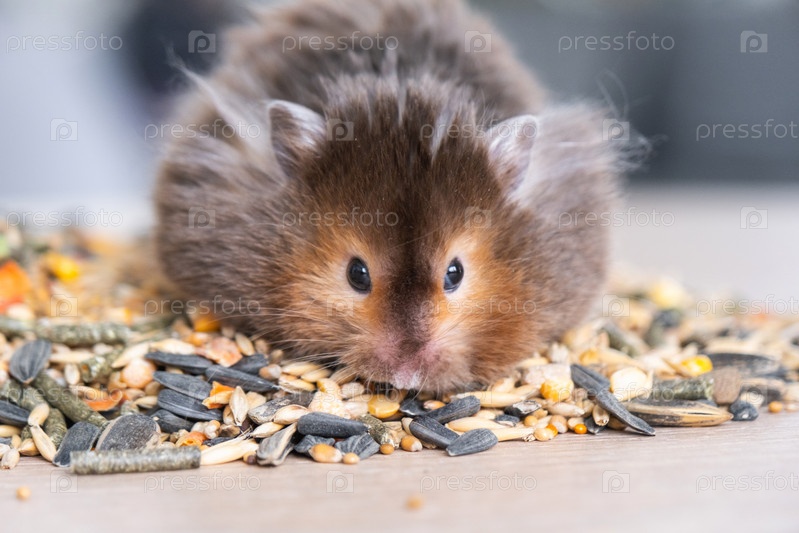 Забавный пушистый сирийский хомяк сидит на пригоршне семян, ест и набивает щеки запасами. Корм для домашних грызунов, витамины. Крупный план