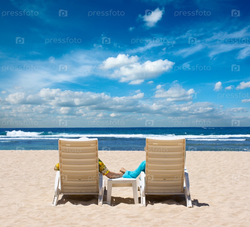 Влюбленная пара на шезлонгах возле океана