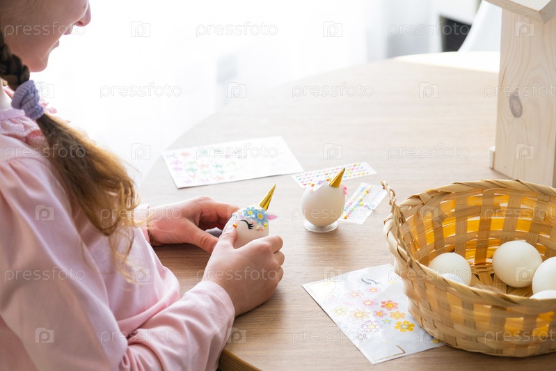 Милая девочка с розовыми заячьими ушками делает пасхальную поделку - украшает яйцо в виде единорога стразами, рогом, цветами в интерьере дома растениями