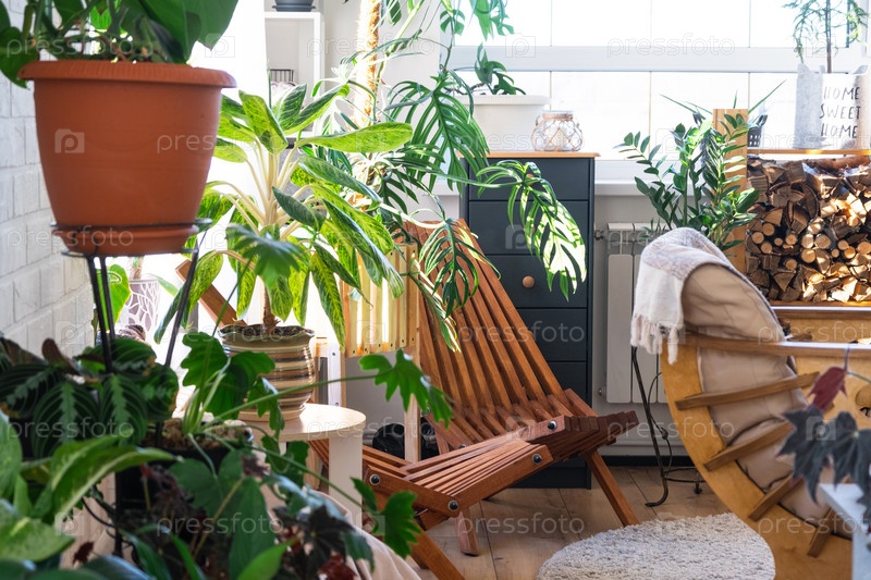 Тропические комнатные растения в интерьере белого чердака комнаты в загородном доме, деревянная мебель, дрова для камина при солнечном свете. Комнатное растение Выращивание и уход за горшечными растениями, зеленый дом в коттедже