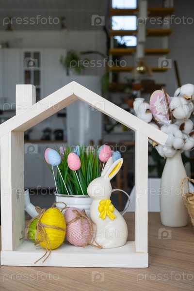 Крошечный уютный домик с пасхальным декором с кроликом и яйцами на кухонном столе. Строительство, дизайн, проект, переезд в новый дом, ипотека, страхование, аренда и покупка недвижимости