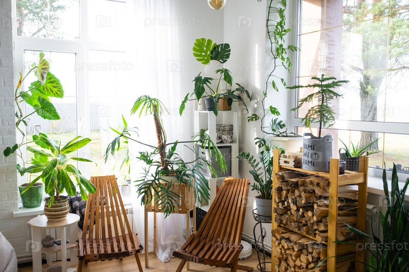 Тропические комнатные растения в интерьере белого чердака комнаты в загородном доме, деревянная мебель, дрова для камина при солнечном свете. Комнатное растение Выращивание и уход за горшечными растениями, зеленый дом в коттедже