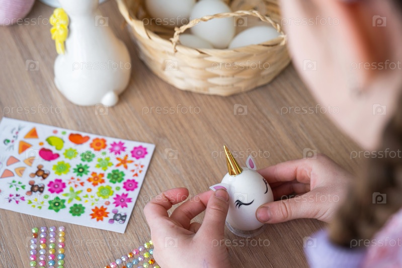 Милая девочка с розовыми заячьими ушками делает пасхальную поделку - украшает яйцо в виде единорога стразами, рогом, цветами в интерьере дома растениями