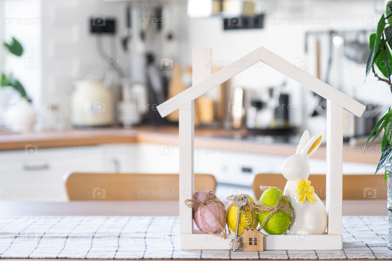 Ключ и крошечный домик уютного дома с пасхальным декором с кроликом и яйцами на кухонном столе. Строительство, дизайн, проект, переезд в новый дом, ипотека, страхование, аренда и покупка недвижимости