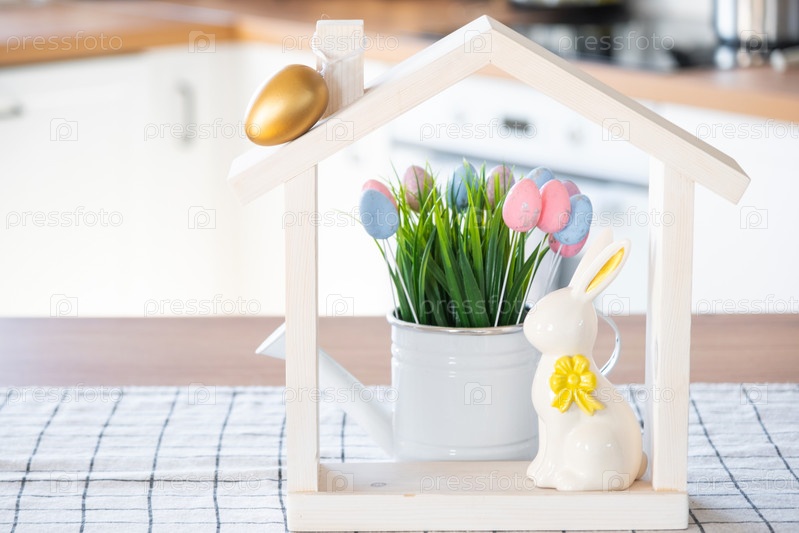 Крошечный уютный домик с пасхальным декором с кроликом и яйцами на кухонном столе. Строительство, дизайн, проект, переезд в новый дом, ипотека, страхование, аренда и покупка недвижимости