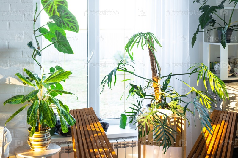 Тропические комнатные растения в интерьере белого чердака комнаты в загородном доме, деревянная мебель, дрова для камина при солнечном свете. Комнатное растение Выращивание и уход за горшечными растениями, зеленый дом в коттедже
