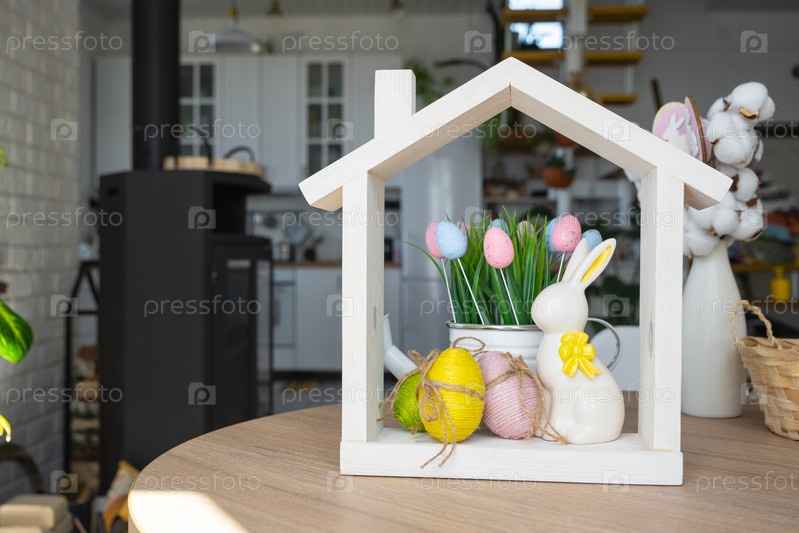 Крошечный уютный домик с пасхальным декором с кроликом и яйцами на кухонном столе. Строительство, дизайн, проект, переезд в новый дом, ипотека, страхование, аренда и покупка недвижимости