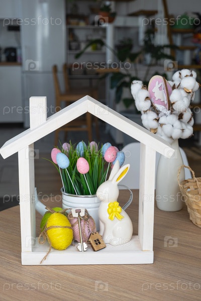 Ключ и крошечный домик уютного дома с пасхальным декором с кроликом и яйцами на кухонном столе. Строительство, дизайн, проект, переезд в новый дом, ипотека, страхование, аренда и покупка недвижимости