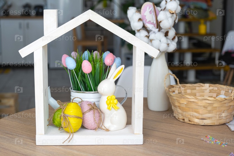 Крошечный уютный домик с пасхальным декором с кроликом и яйцами на кухонном столе. Строительство, дизайн, проект, переезд в новый дом, ипотека, страхование, аренда и покупка недвижимости