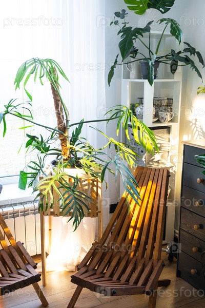 Тропические комнатные растения в интерьере белого чердака комнаты в загородном доме, деревянная мебель, дрова для камина при солнечном свете. Комнатное растение Выращивание и уход за горшечными растениями, зеленый дом в коттедже