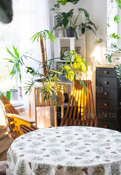 Пустой круглый стол для установки и демонстрации продукта в интерьере с тропическими комнатными растениями в загородной теплице. Комнатное растение Выращивание и уход за горшечным растением, теплица на даче