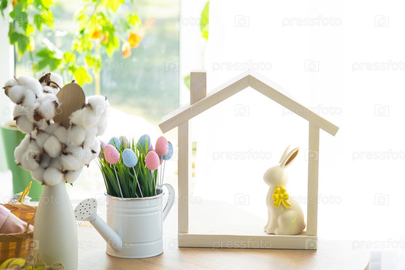 Крошечный уютный домик с пасхальным декором с кроликом и яйцами на кухонном столе. Строительство, дизайн, проект, переезд в новый дом, ипотека, страхование, аренда и покупка недвижимости