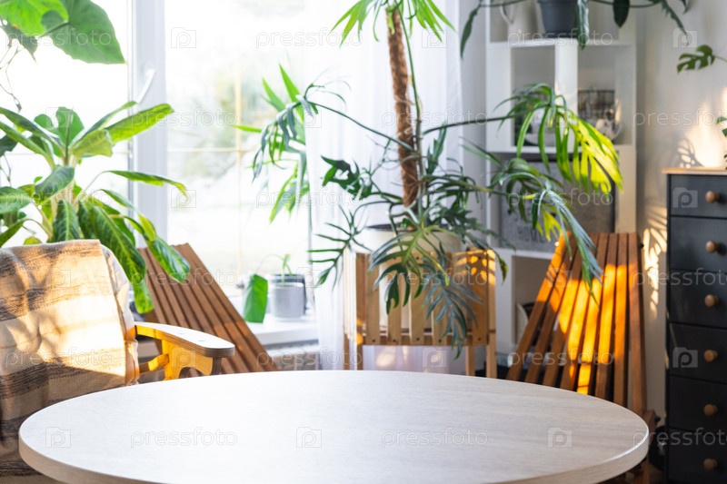 Пустой круглый стол для установки и демонстрации продукта в интерьере с тропическими комнатными растениями в загородной теплице. Комнатное растение Выращивание и уход за горшечным растением, теплица на даче