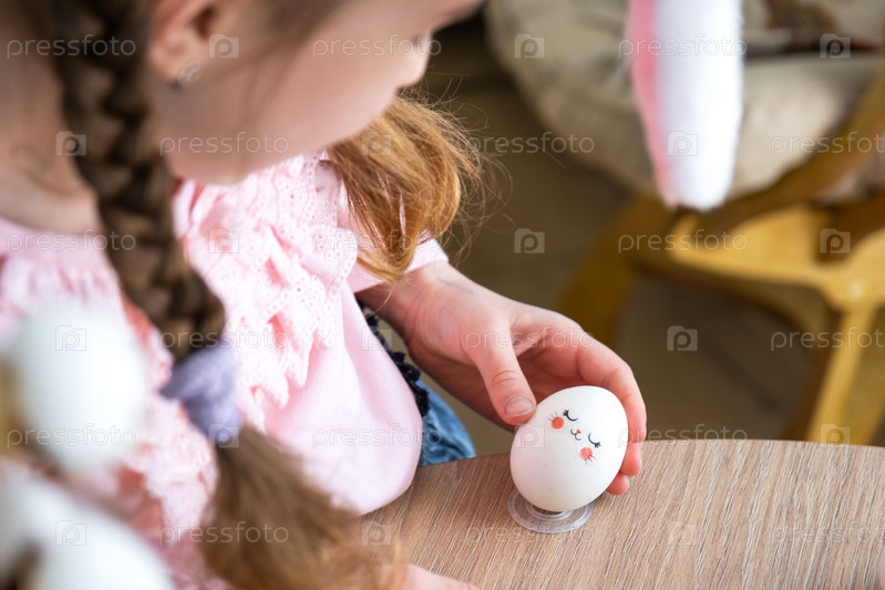 Милая девочка с розовыми заячьими ушками делает пасхальную поделку - украшает яйцо в виде единорога стразами, рогом, цветами в интерьере дома растениями