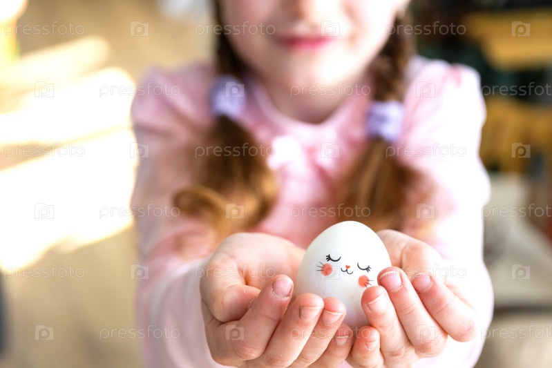 Милая девочка с розовыми заячьими ушками делает пасхальную поделку - украшает яйцо в виде единорога стразами, рогом, цветами в интерьере дома растениями