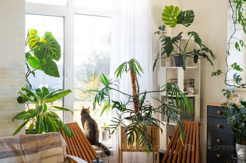 Тропические комнатные растения в интерьере белого чердака комнаты в загородном доме, деревянная мебель, дрова для камина при солнечном свете. Комнатное растение Выращивание и уход за горшечными растениями, зеленый дом в коттедже