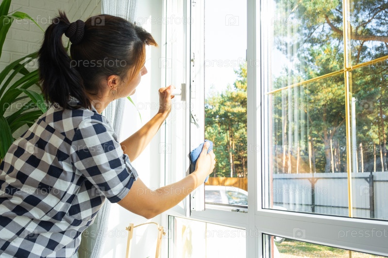 Женщина вручную моет окно дома тряпкой с распылителем и шваброй внутри интерьера с белыми шторами. Наведение порядка и чистоты весной, клининговые услуги
