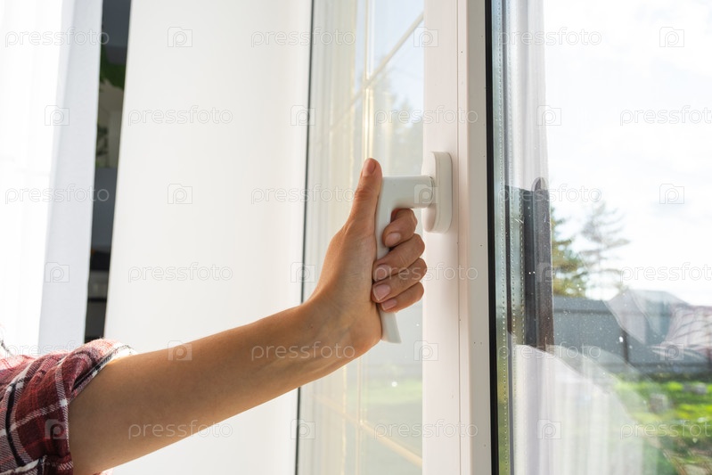 Рука держит ручку пластикового стеклопакета, закрытие и открытие окна поворотным механизмом, положение ручки для вентиляции, микровентиляции