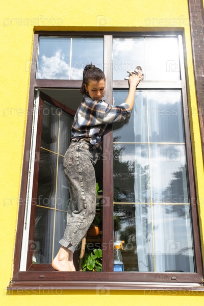 Женщина вручную моет окно дома тряпкой с распылителем и шваброй снаружи. Безопасность на высоте, наведение порядка и чистоты весной, клининговые услуги