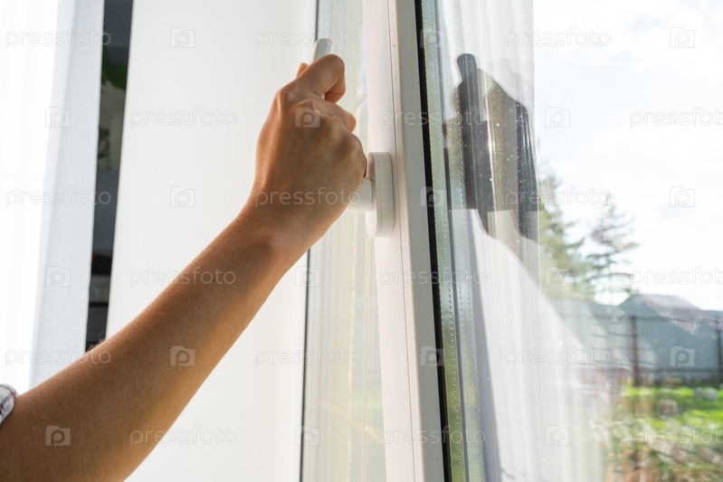 Рука держит ручку пластикового стеклопакета, закрытие и открытие окна поворотным механизмом, положение ручки для вентиляции, микровентиляции