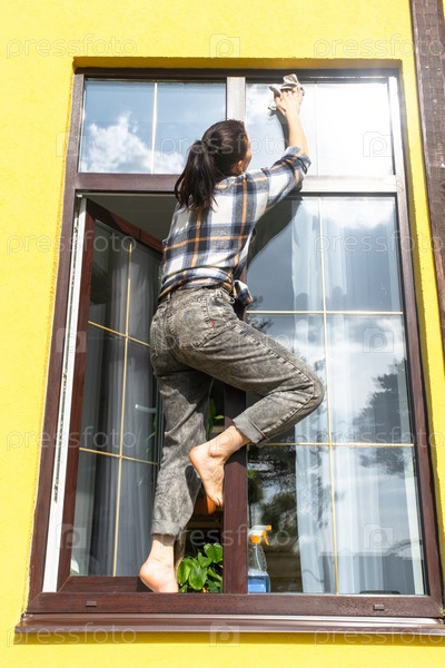 Женщина вручную моет окно дома тряпкой с распылителем и шваброй снаружи. Безопасность на высоте, наведение порядка и чистоты весной, клининговые услуги