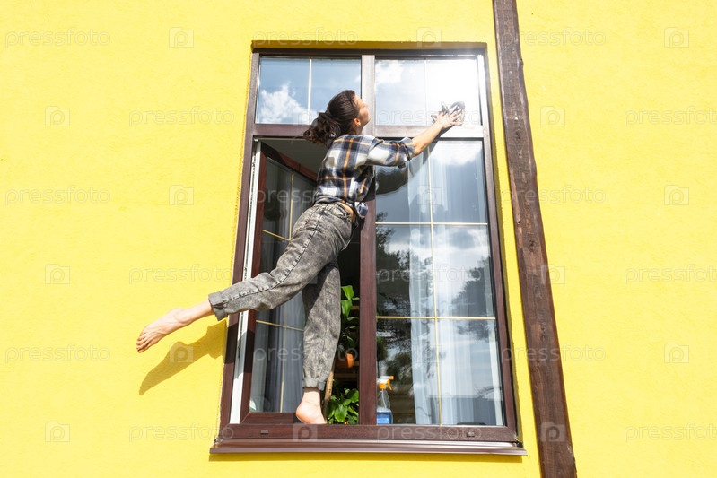 Женщина вручную моет окно дома тряпкой с распылителем и шваброй снаружи. Безопасность на высоте, наведение порядка и чистоты весной, клининговые услуги