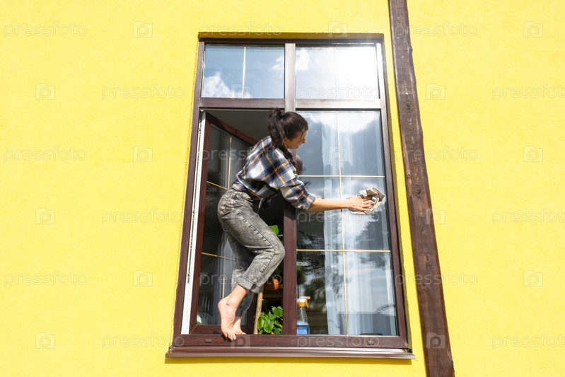 Женщина вручную моет окно дома тряпкой с распылителем и шваброй снаружи. Безопасность на высоте, наведение порядка и чистоты весной, клининговые услуги