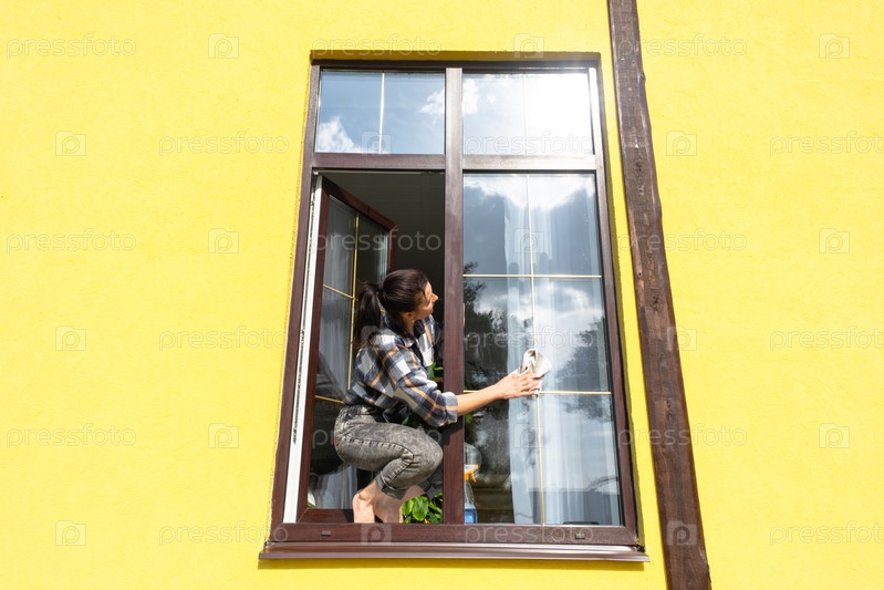 Женщина вручную моет окно дома тряпкой с распылителем и шваброй снаружи. Безопасность на высоте, наведение порядка и чистоты весной, клининговые услуги