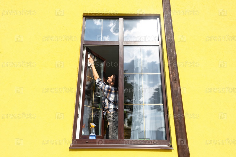 Женщина вручную моет окно дома тряпкой с распылителем и шваброй снаружи. Безопасность на высоте, наведение порядка и чистоты весной, клининговые услуги