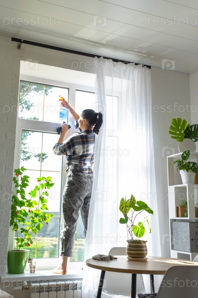 Женщина вручную моет окно дома тряпкой с распылителем и шваброй внутри интерьера с белыми шторами. Наведение порядка и чистоты весной, клининговые услуги