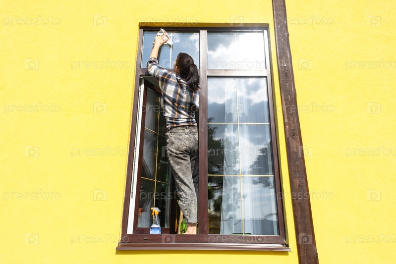 Женщина вручную моет окно дома тряпкой с распылителем и шваброй снаружи. Безопасность на высоте, наведение порядка и чистоты весной, клининговые услуги