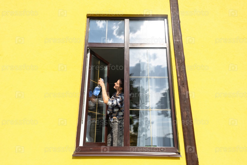 Женщина вручную моет окно дома тряпкой с распылителем и шваброй снаружи. Безопасность на высоте, наведение порядка и чистоты весной, клининговые услуги