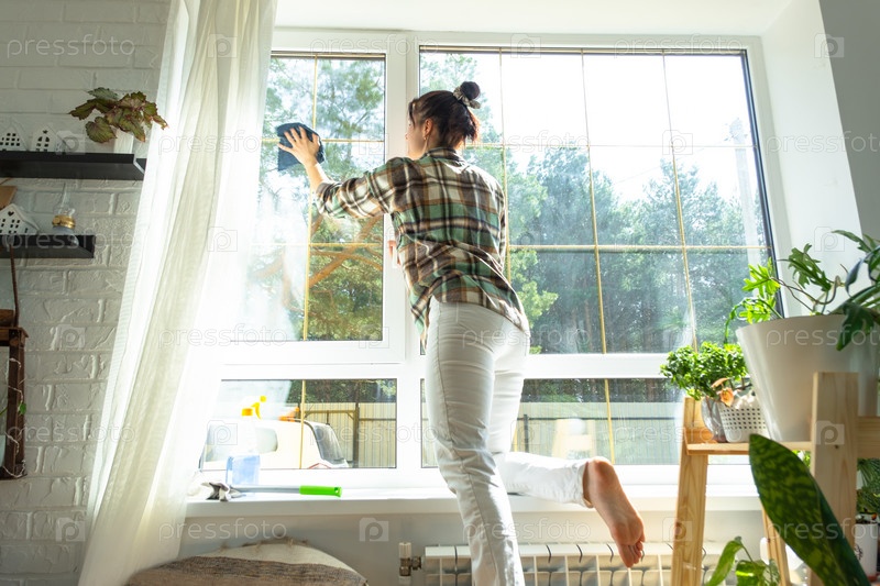 Женщина вручную моет окно дома тряпкой с распылителем и шваброй внутри интерьера с белыми шторами. Наведение порядка и чистоты весной, клининговые услуги