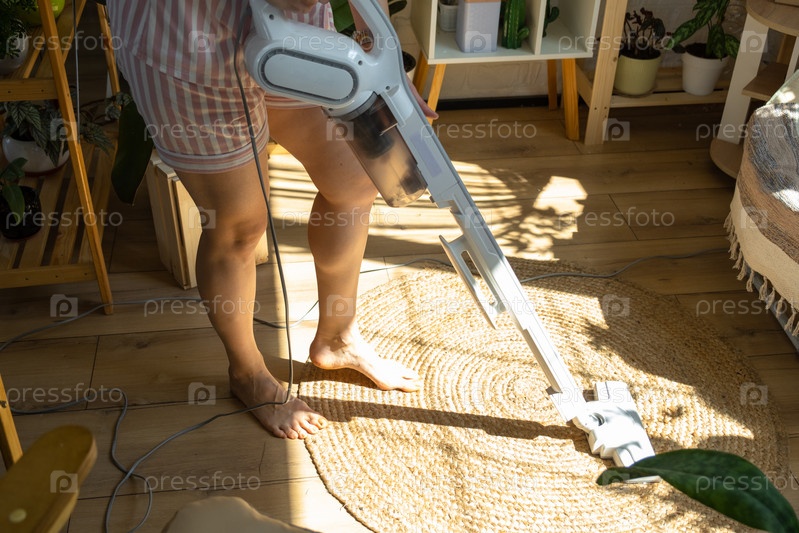 Женщина пылесосит круглый ковер в доме среди комнатных растений ручным пылесосом. Генеральная уборка дома, уборка и домохозяйка