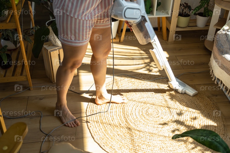 Женщина пылесосит круглый ковер в доме среди комнатных растений ручным пылесосом. Генеральная уборка дома, уборка и домохозяйка