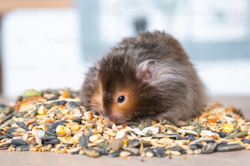 Забавный пушистый сирийский хомяк сидит на пригоршне семян, ест и набивает щеки запасами. Корм для домашних грызунов, витамины. Крупный план