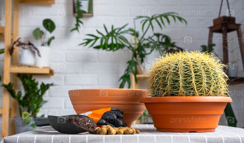 Пересадка выросшего домашнего растения большого колючего кактуса Echinocactus Gruzoni в новый горшок большего размера.Уход за горшечным растением, защитные перчатки, дренаж, горшок, почва, лопата на столе