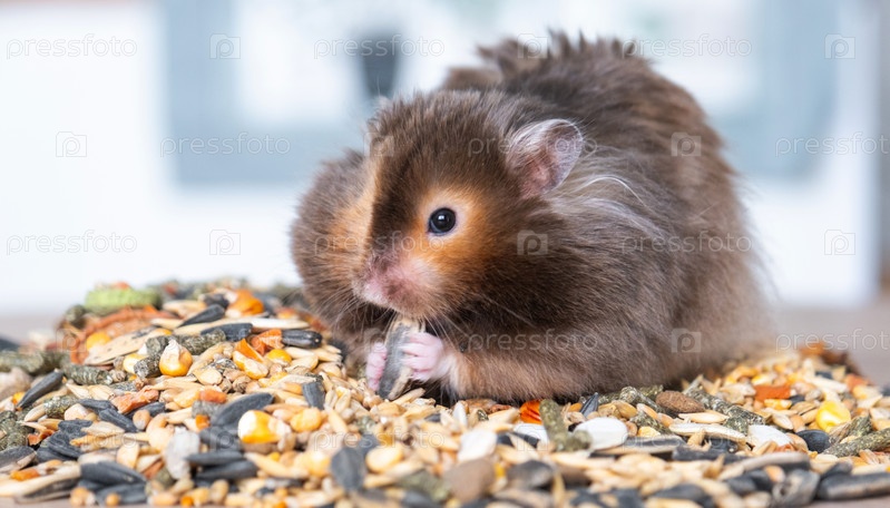 Забавный пушистый сирийский хомяк сидит на пригоршне семян, ест и набивает щеки запасами. Корм для домашних грызунов, витамины. Крупный план