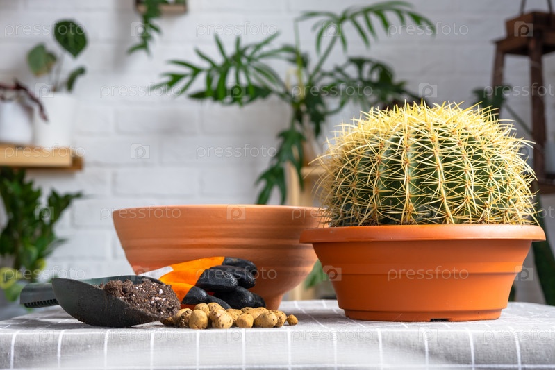 Пересадка выросшего домашнего растения большого колючего кактуса Echinocactus Gruzoni в новый горшок большего размера.Уход за горшечным растением, защитные перчатки, дренаж, горшок, почва, лопата на столе