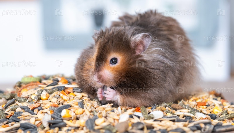 Забавный пушистый сирийский хомяк сидит на пригоршне семян, ест и набивает щеки запасами. Корм для домашних грызунов, витамины. Крупный план