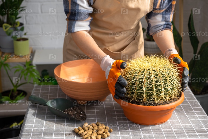 Пересадка выросшего домашнего растения большого колючего кактуса Echinocactus Gruzoni в новый горшок большего размера.Женщина с защитными перчатками осторожно держит кактус, опасаясь укола