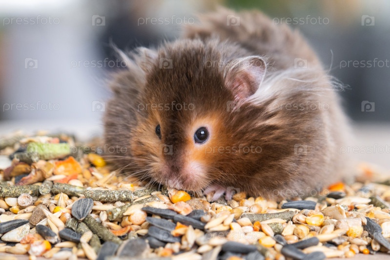 Забавный пушистый сирийский хомяк сидит на пригоршне семян, ест и набивает щеки запасами. Корм для домашних грызунов, витамины. Крупный план
