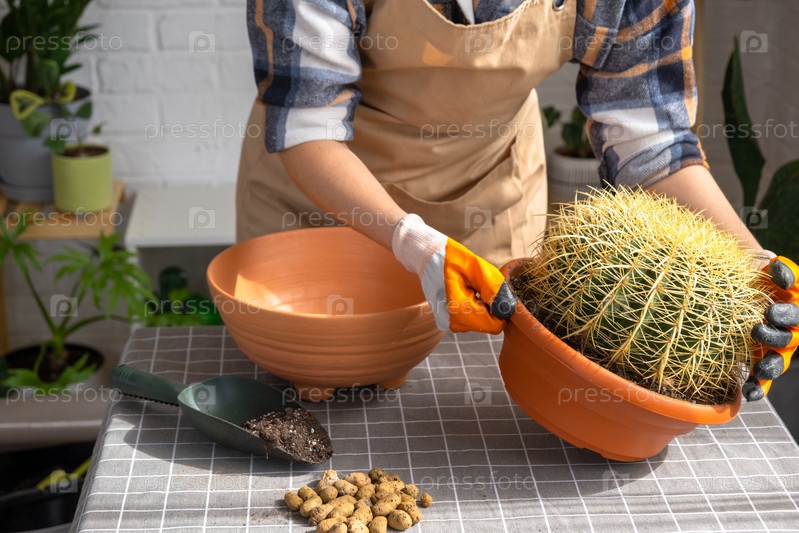 Пересадка выросшего домашнего растения большого колючего кактуса Echinocactus Gruzoni в новый горшок большего размера.Женщина с защитными перчатками осторожно держит кактус, опасаясь укола