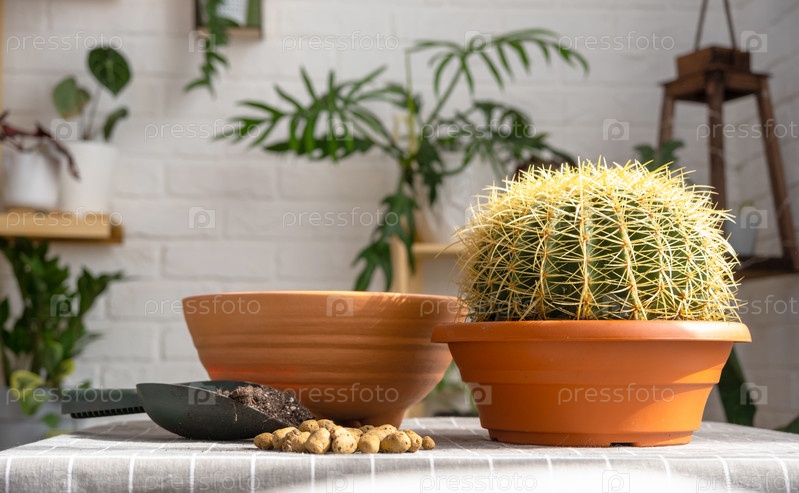 Пересадка выросшего домашнего растения большого колючего кактуса Echinocactus Gruzoni в новый горшок большего размера.Уход за горшечным растением, защитные перчатки, дренаж, горшок, почва, лопата на столе