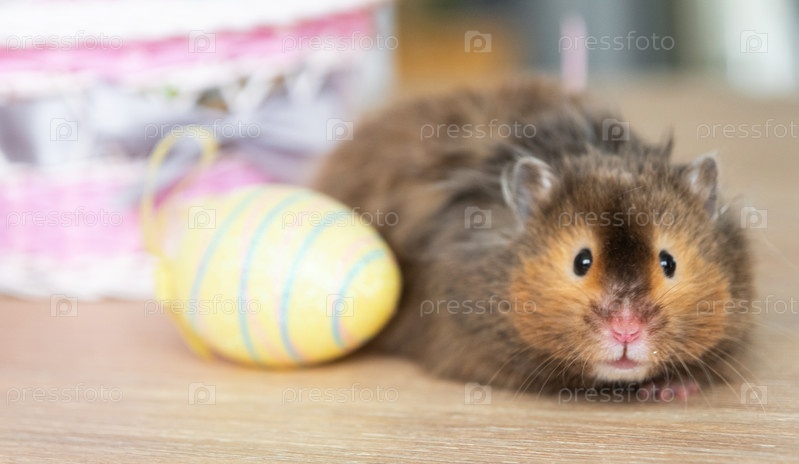 Забавный пушистый хомяк вылезает из корзины с разноцветными пасхальными яйцами - праздничный пасхальный декор с домашним питомцем