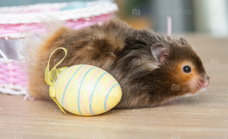 Забавный пушистый хомяк вылезает из корзины с разноцветными пасхальными яйцами - праздничный пасхальный декор с домашним питомцем
