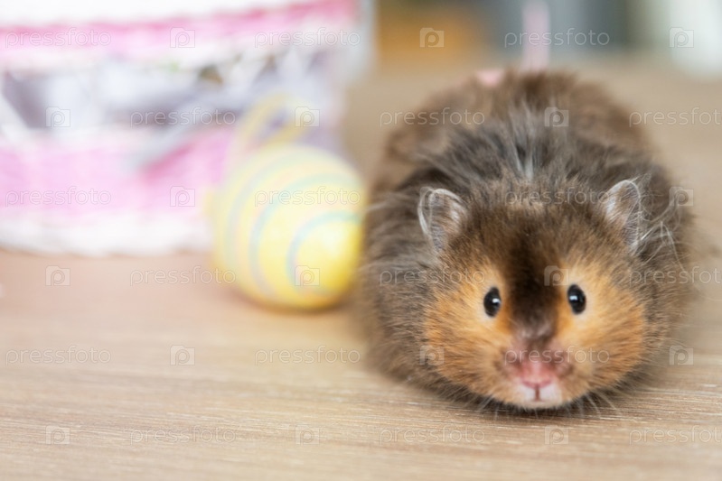 Забавный пушистый хомяк вылезает из корзины с разноцветными пасхальными яйцами - праздничный пасхальный декор с домашним питомцем