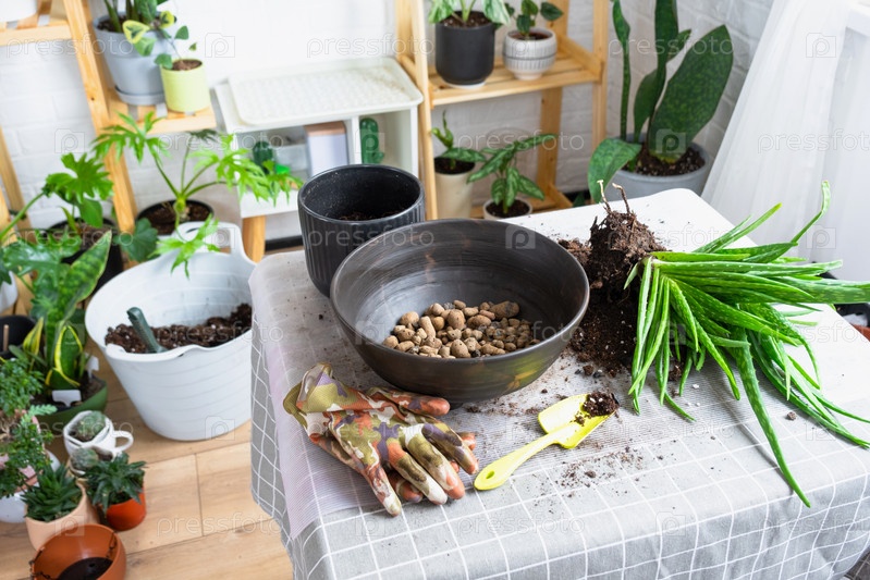 Гранулы керамзита для отвода воды из корневой системы на дно горшка для посадки и пересадки растения Алоэ Вера. Суккулент на столе, горшке, почве, совок